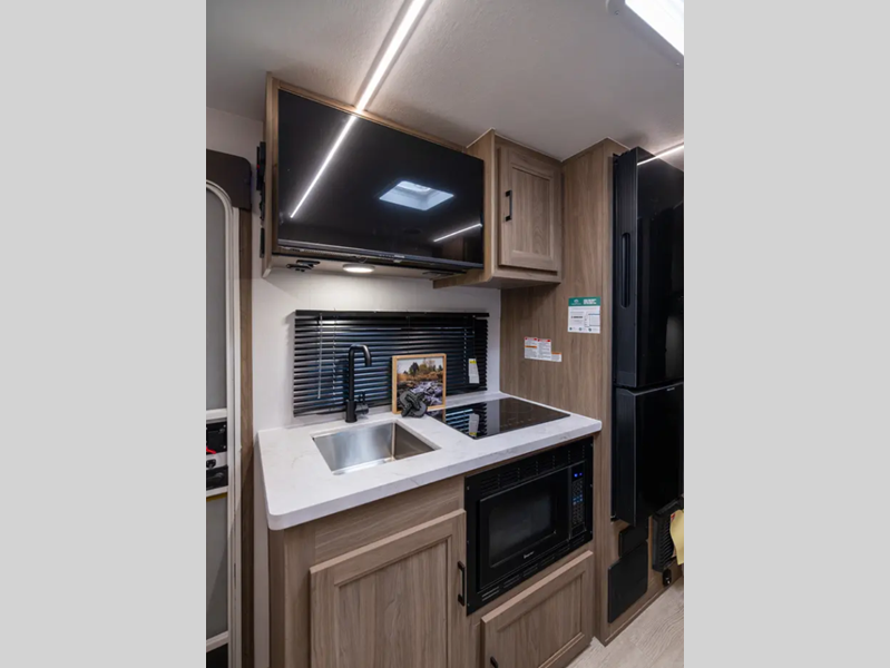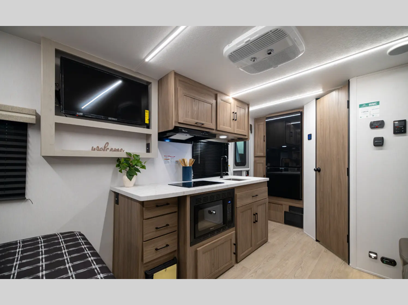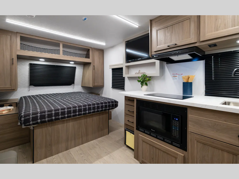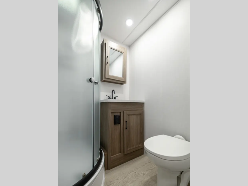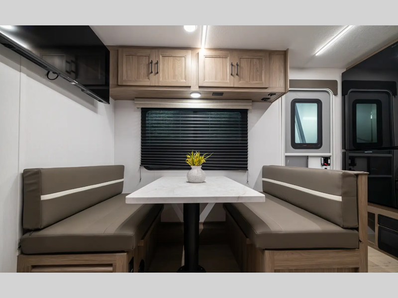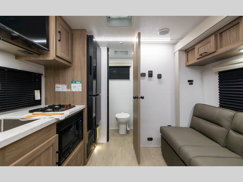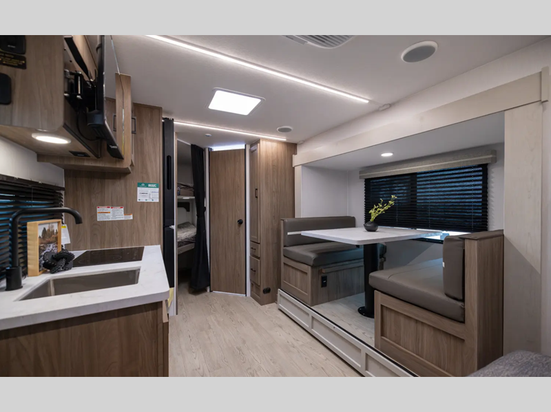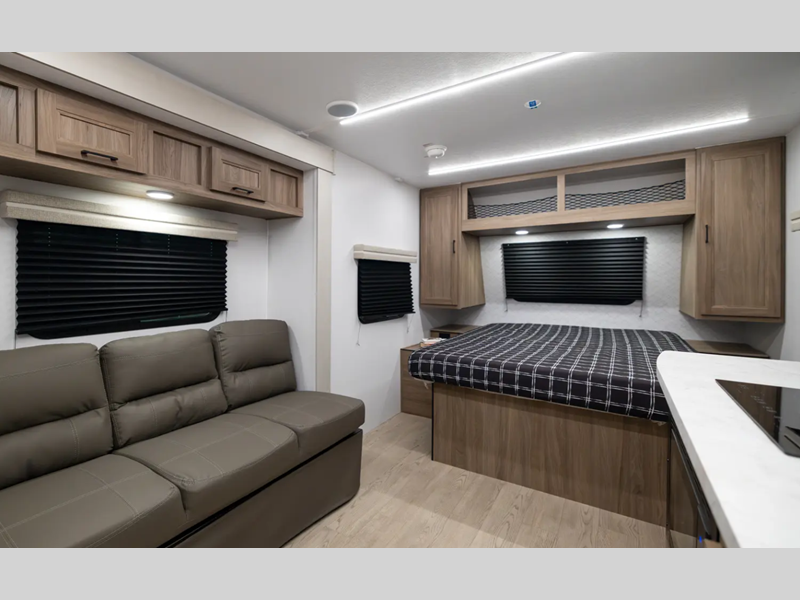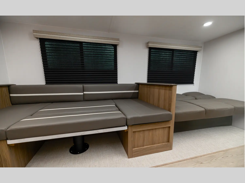 With each model you will find a heated and enclosed underbelly, Dicor Tufflex PVC Roofing, and Dexter E-Z Lube axles for smooth towing. The velarium velocity switch power awning with light strip will provide an inviting outdoor living space, and there is a convenient pet leash and bottle opener. Inside, you will appreciate the wear-resistant vinyl flooring and the night shades for privacy. These travel trailers also include a power tongue jack so you can easily hitch up and head out!