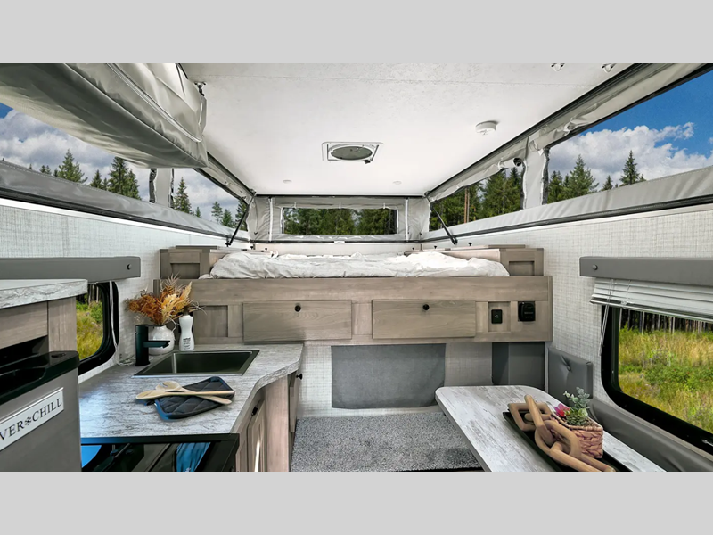 Sleeps 3 Length 14 ft 10 in Ext Width 7 ft 2 in Ext Height 6 ft Exterior Color White, Grey Dry Weight 1911 lbs Fresh Water Capacity 15 gals Grey Water Capacity 5 gals Black Water Capacity 6.5 gals Furnace BTU 20000 btu Available Beds Queen Refrigerator Type 12V Refrigerator Size 3.3 cu ft Cooktop Burners 2 Floor Length 8 ft 6 in LP Tank Capacity 20 lbs Truck Bed Size Long Number of LP Tanks 1 Body Style Pop-Up Shower Type Wet/Bath Shower -